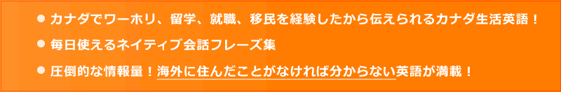 この英語フレーズブックは私がカナダで ワーホリ、大学、就職、移民 それぞれの過程で学んでいった使える実践的な英語を紹介するウェブサイトからスタートしました。