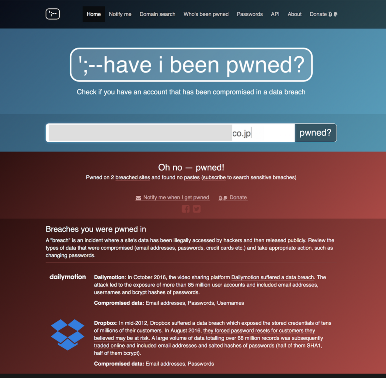 Have I Been Pwned?(今まで流出したことある?)略して HIBPと呼ばれている。